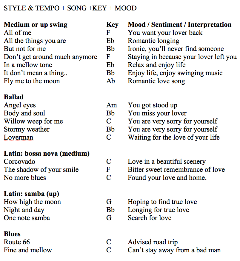 The choice for your opener, your first song depends on the mood you want to convey, and what style jazz singer you are. Are you a storyteller, an entertainer or an instrumentalist? Or are you all these things? Or maybe two styles resonate with you most, like a storyteller and an instrumentalist? It’s up to you!